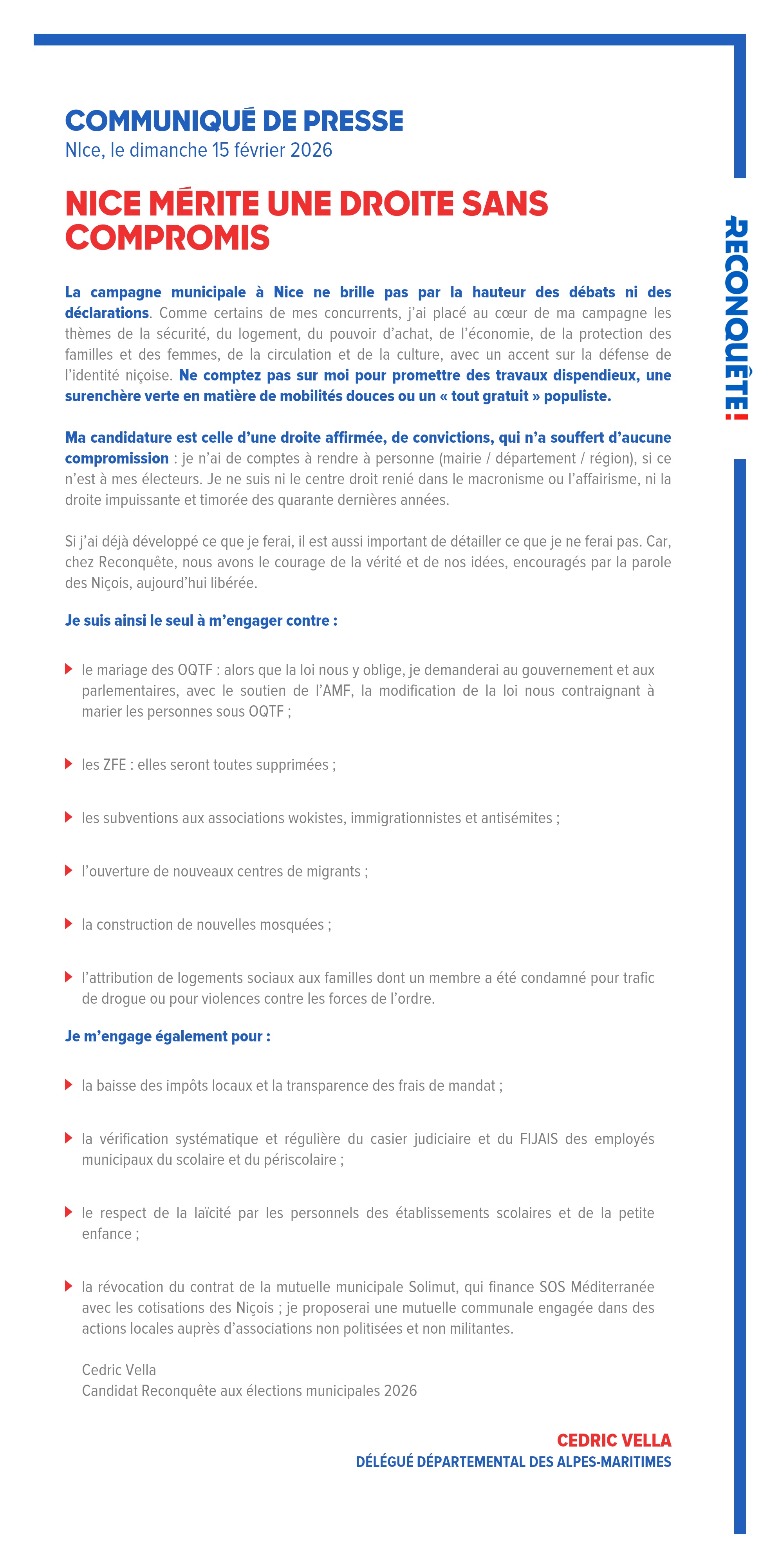 Si j’ai déjà développé ce que je ferai, il est aussi important de détailler ce que je ne ferai pas. Car, chez Reconquête, nous avons le courage de la vérité et de nos idées, encouragés par la parole des Niçois, aujourd’hui libérée.